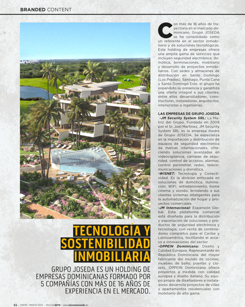 Grupo Joseda esta destacada Marca es el componente de un Holding de Empresas, formado por 5 Compañías Dominicanas. Con más de 16 años de experiencia en el mercado nacional e internacional. El Grupo se encuentra presente en el Desarrollo inmobiliario, Tecnología, Seguridad e importación. Con sedes en Santo Domingo, Santiago y Punta Cana, la compañía se ha consolidado como un referente en su sector dentro de la República Dominicana.