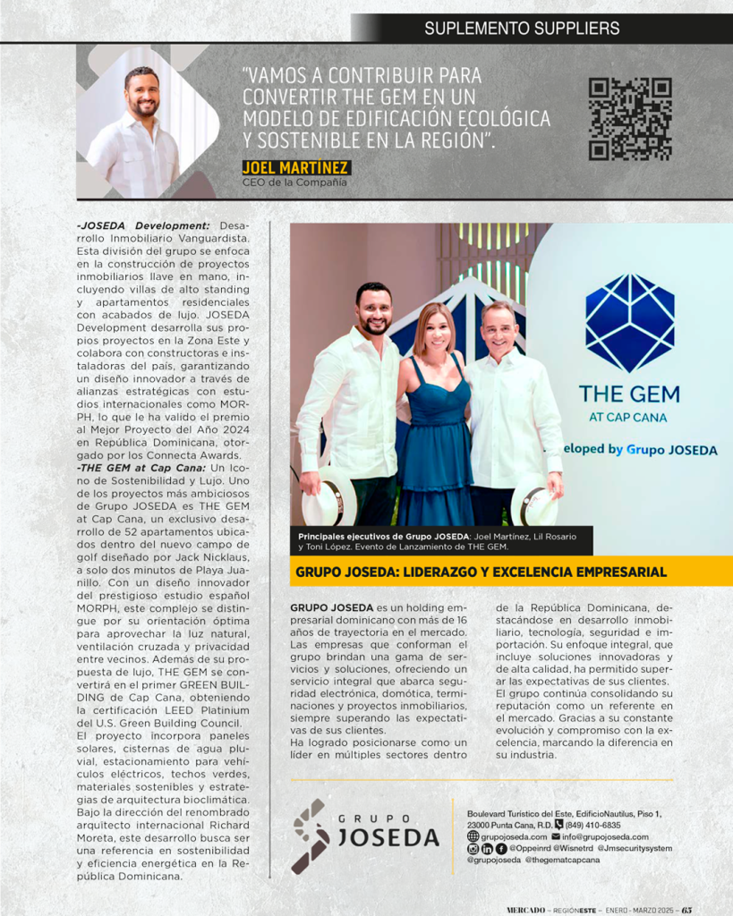 Grupo JOSEDA tuvo el honor de participar en el evento organizado por la revista Mercado Región Este, donde se lanzó la edición especial BUILDING DREAMS IN PARADISE. Como uno de los patrocinadores principales, destacó su compromiso con la comunidad y su visión de construir sueños en un entorno paradisíaco. Este evento permitió conectar con líderes de la industria y presentar su filosofía empresarial a una audiencia apasionada por la innovación en la región.