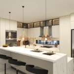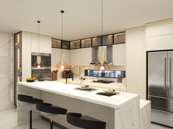 - Diseño de Cocina Abierta: La cocina está diseñada con una isla central que se convierte en el corazón del espacio, perfecta para reuniones sociales o cenas familiares. Los gabinetes inferiores están hechos de madera natural, proporcionando un contraste sutil pero efectivo con las superficies de trabajo en cuarzo blanco.